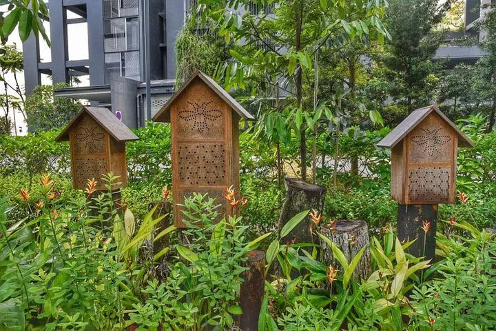 A Housing Board project in Queenstown is also home to peaceful solitary bees and small birds such as the oriental magpie-robin, thanks to insect hotels, hanging drilled wood logs and nest boxes that recreate habitats for a thriving local biodiversity.