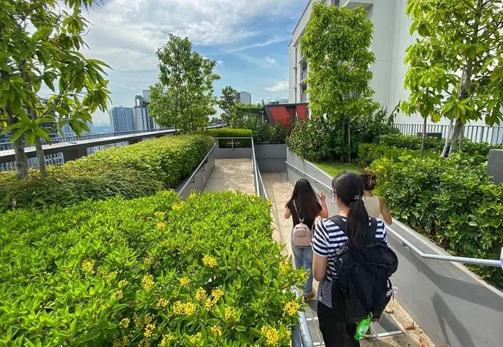 On the ground level, a 200m-long community eco-corridor offers pockets of seating beneath 18 mature shady trees, including rain tree and broad-leafed mahogany.