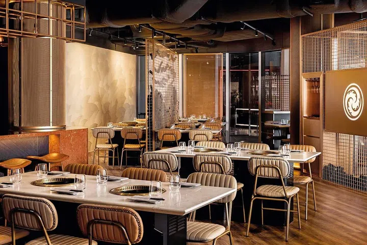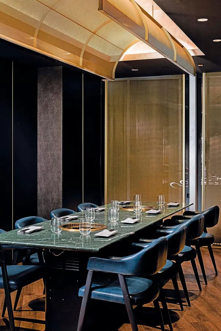 While the finest cuts of meat are grilled to perfection by a dedicated, skilled chef, gold is the primary colour of the metal in this private dining area to reflect the aesthetic of the original Yen Yakiniku.