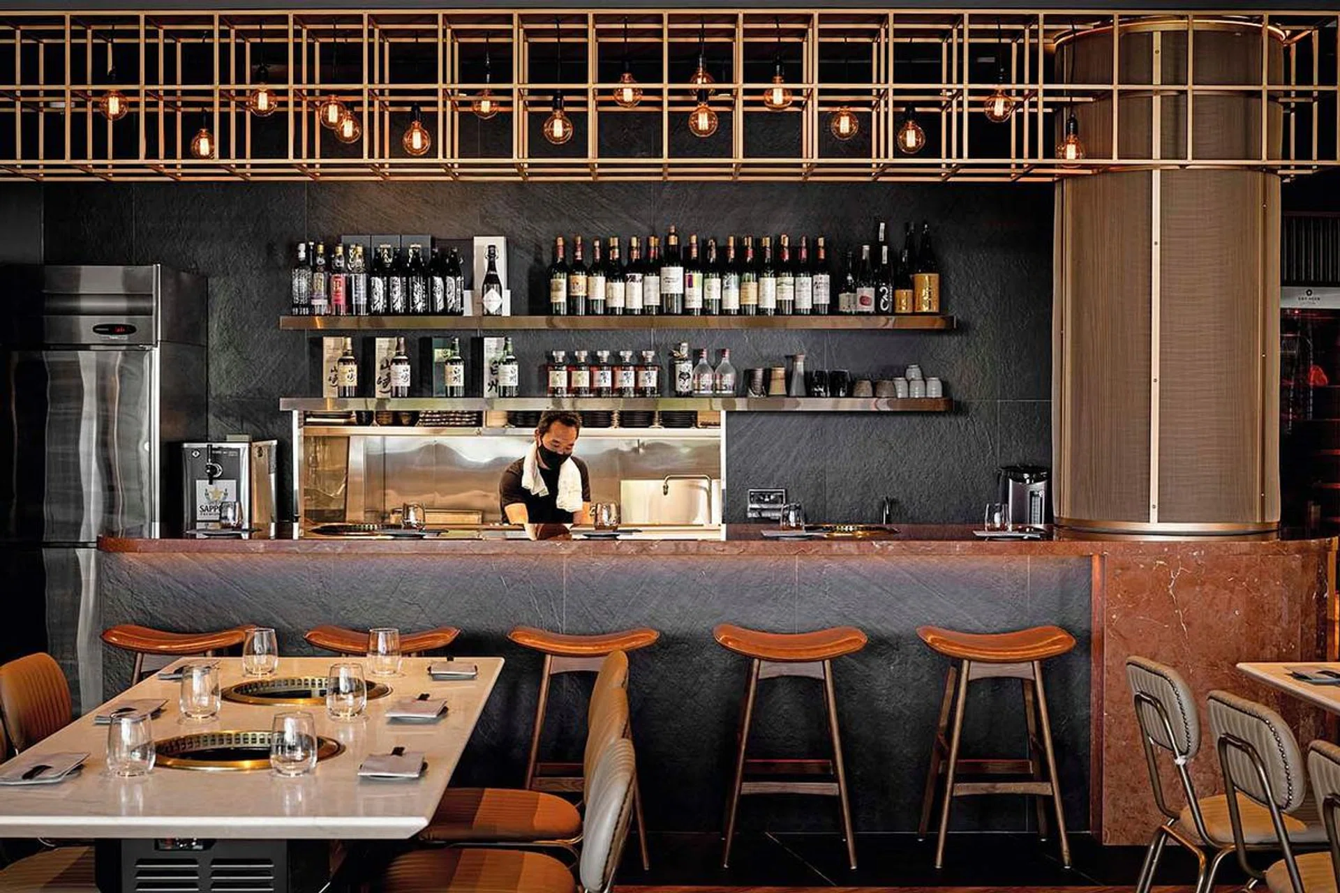 With the irresistible aroma of grilling meat and the underlying essence of yakiniku in mind, the bar’s Alicante red marble countertop calls to mind a sublime cut of beef on its charcoal backdrop.