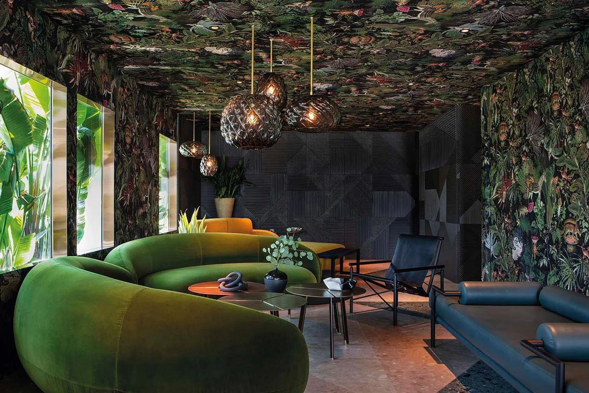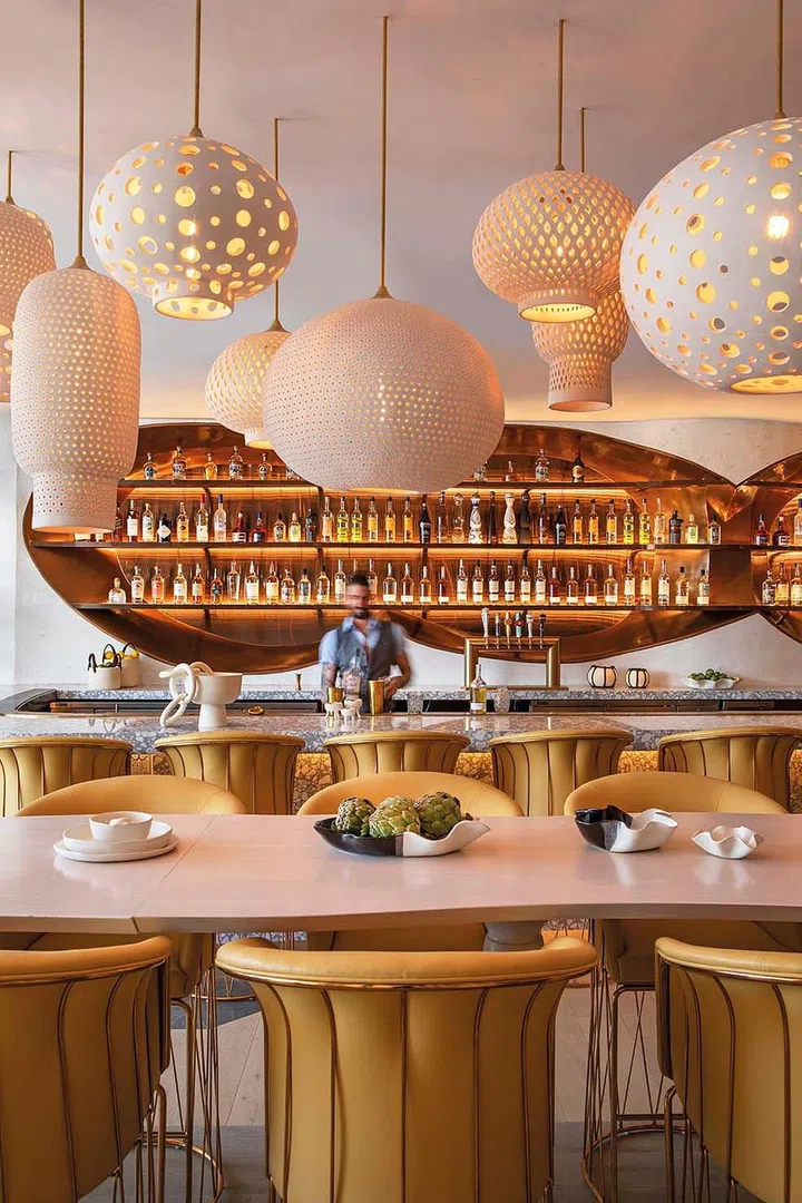 An all-open facade leads to the restaurant on the ground floor, which features indoor open dining spaces in the centre and on the right side of the interior, plus a bar on the left side. “We wanted to welcome neighbours and guests with open arms,” says Gulla, who applied nature’s curved forms throughout the space.