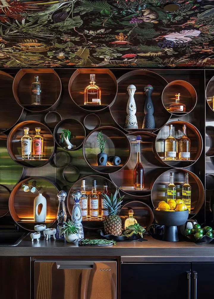 Vases, baskets, bowls, and other items from this new line adorn Esperanza’s different areas. In contrast to the lighter main area of the restaurant, the bar and cocktail area are in moody shades of green. “I opened my first True Religion flagship store on the same street, so it was great to be back,” Kym says. “It all came full circle for me.”