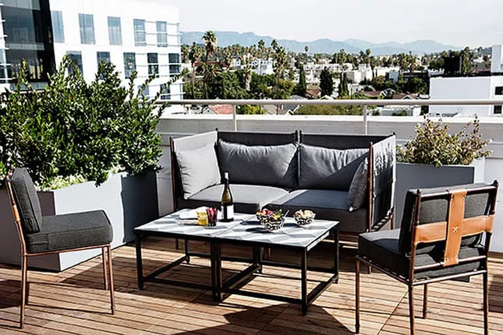 Flooded with daylight from the adjacent courtyard, the main lobby is the heart of NeueHouse Hollywood, where all members begin and end their day. Here, raw materials such as the lacquered concrete floors and those of the exposed structural details juxtapose against the elegance of these minimalist sofas and Moroccan rugs.