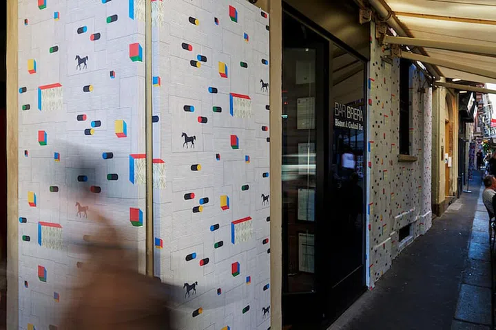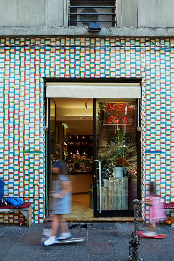 The nondescript shops, ranging from an ice cream parlour to a bar, take on a new look with the brightly-coloured wallpaper designs.
