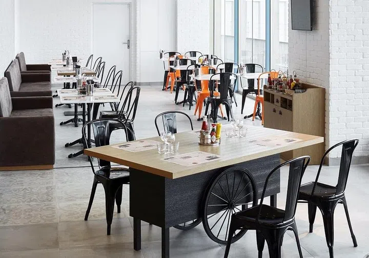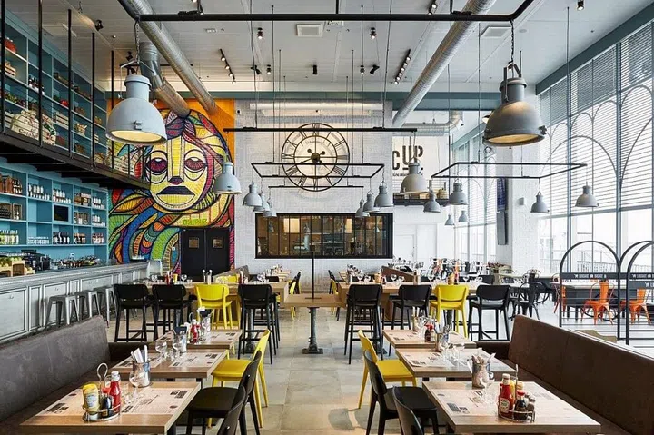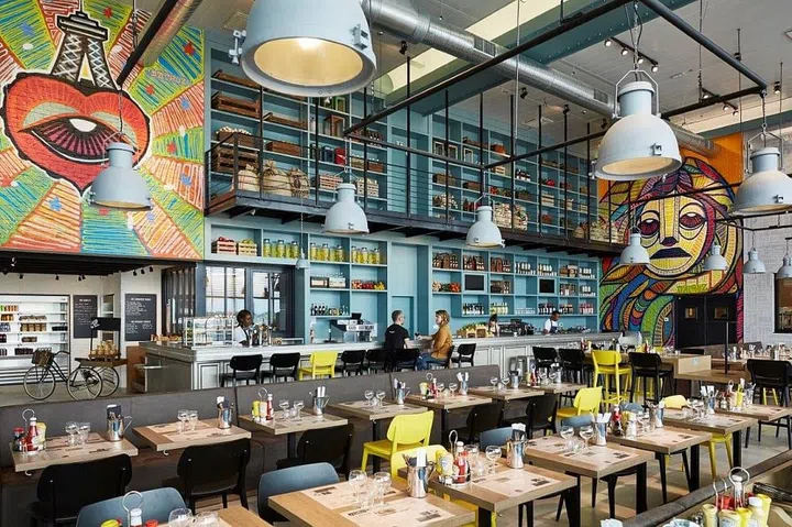 The restaurant is designed by Parisian interior design agency Studio Marc Hertrich & Nicolas Adnet, and sports a modern industrial loft look, with attractive colours, high ceilings and floor-to-ceiling windows.