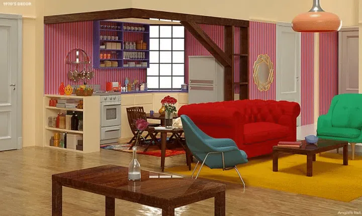 As the 70’s involved bold, cultural clashes, Monica’s apartment would feature strong furniture colors and a clashing pinstripe wallpaper. We love the Guzzini-style mushroom lamp, though!