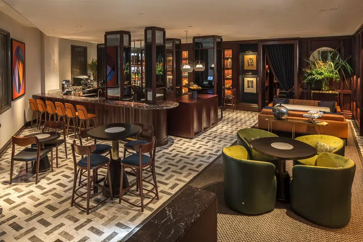 Long-slung trendy furniture, interesting decor and ambient lighting, as well as classic black and white flooring, tinted mirrors and dark wood finishes add to the luxe look of the place.