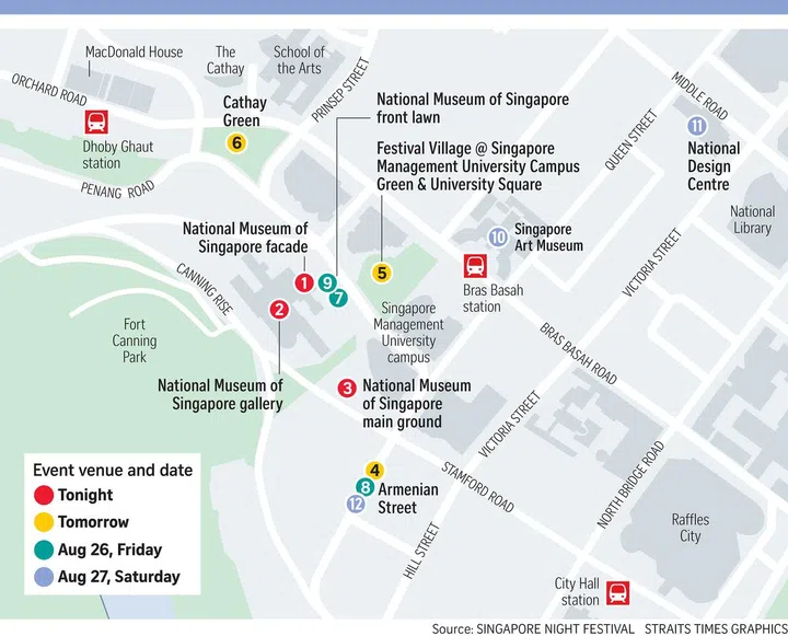 Here's a handy map to see where everything's happening. Source: Singapore Night Festival, Straits Times Graphics