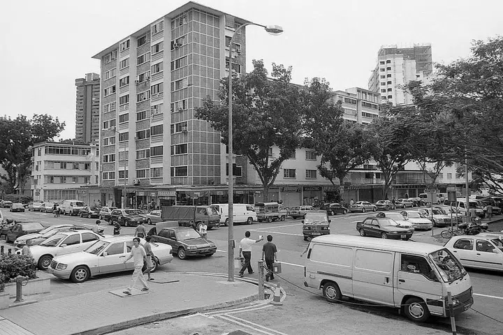 Nine-storey “skyscraper” flats at the junction of Prinsep Street and Short Street in October 2001. Block 13, with 196 two-room flats and eight maisonettes, had one of the largest number of units in a single block. The block had a shopping arcade with 34 shops. The estate was demolished in 2006.