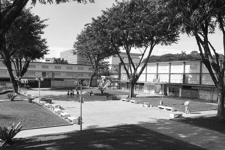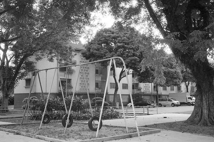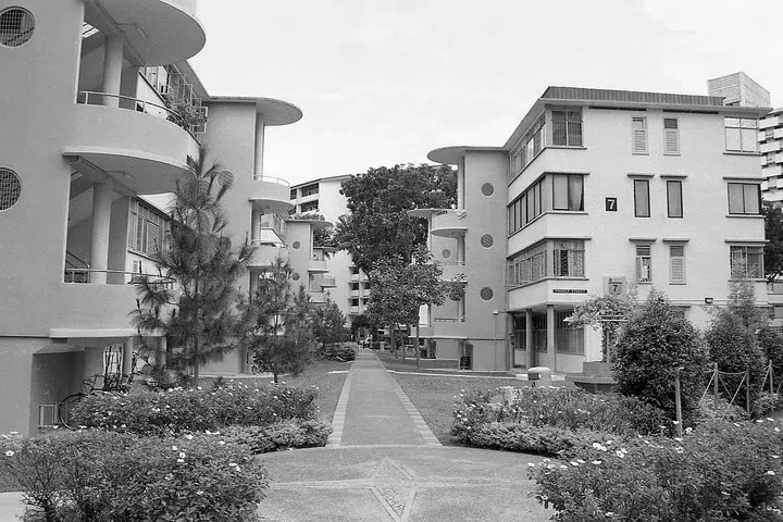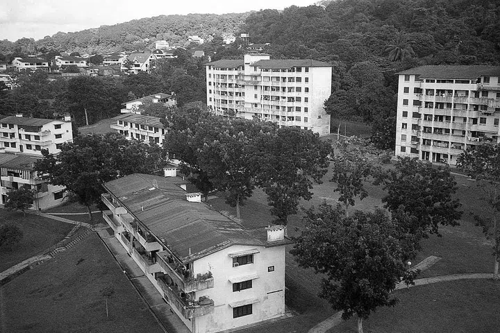 Kampong Silat Estate in September 2001. The layout of the estate mimicked a close-knit traditional Asian village. First came the single-storey artisan quarters and shops, built by SIT in 1948, followed by low-rise blocks of flats. In all, 21 blocks were built, their simple but elegant forms well balanced against the undulating terrain.