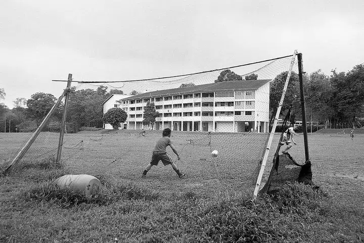 Photo: A field in Seletar West Farmway 6 in March 2004. The estate, which comprised seven blocks of four-storey flats, was completed by the HDB in 1979 and located in an area of pig and poultry farms. Small self-contained public housing estates were built to resettle rural dwellers displaced by land acquisition. After residents were relocated in 2004, the blocks were converted into a foreign workers’ dormitory.