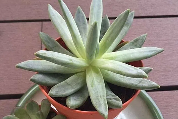 The larger succulent is likely to be a species of Pachyphytum, while the plant in the smaller pot is likely to be a species of Echeveria.