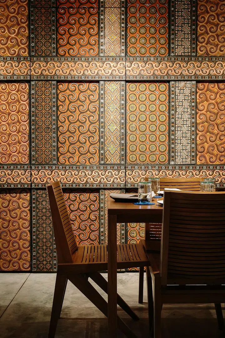The panels are composed of paint — black, as well as yellow and orange hues of local stones — and timber that is grown locally in Toraja.