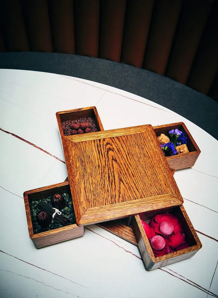 “I’m using more wood vessels for the first time here. After a long dinner, sometimes 2.5 to 3 hours long, diners get tired and full. We’ve specially customised this box for the final course of petit fours to give them something interesting and cheerful to end with strongly.