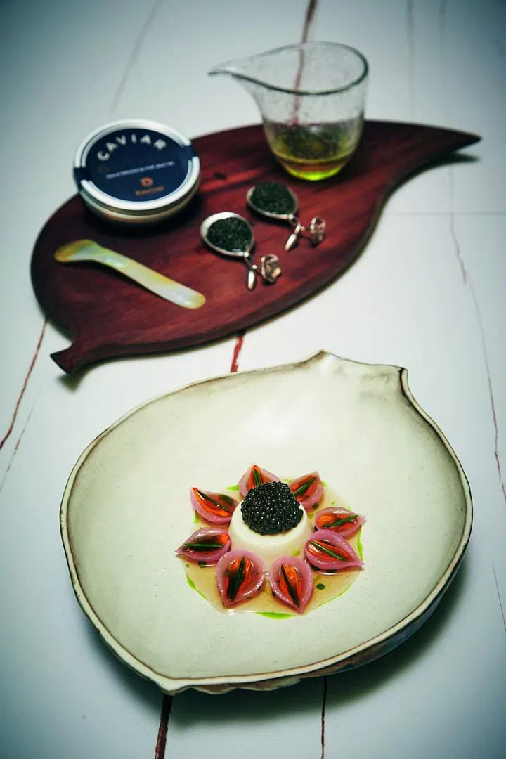 “I had the dish planned in my head before we opened, so I knew what I wanted the plate to look like. Arissa, who also designed the restaurant, made drawings of the dish and found a maker in Taiwan.