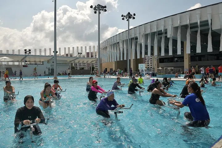 The ActiveSG East Bedok Sports Centre in the hub has four swimming pools, and offers activities such as aqua spinning (above), which involves using stationary bicycles in a swimming pool, a gym, sheltered tennis courts and badminton courts. ST PHOTO: KUA CHEE SIONG
