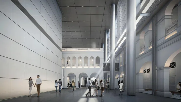 In addition to the original heritage architecture, a new facade on Bras Basah road will feature reflective glass panels running length-wise, with panels progressively angled towards and reflecting the dome of the building.
