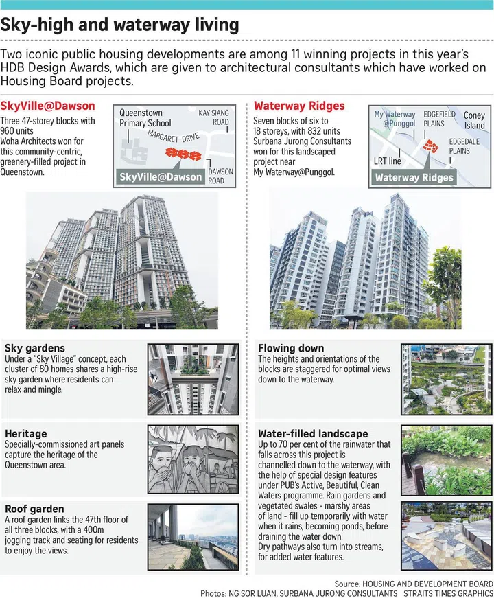 Sky-high gardens and a "terraced" landscape that develops ponds and streams after rain are among the design features of 11 projects for which architectural consultants were recognised in this year's Housing Board (HDB) Design Awards.