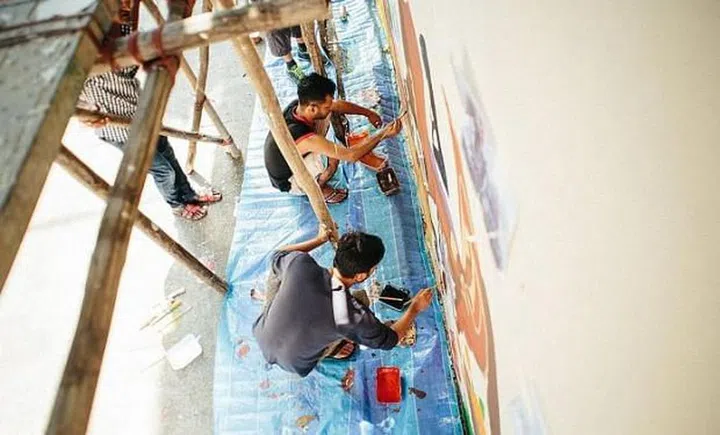 This community art project is spearheaded by Singaporean artist Jaxton Su Jingxiang, 28, a Master of Fine Art student at The Glasgow School of Art. Forty three people — 17 migrant workers, one painting assistant, as well as 23 students and two teachers from Raffles Institution — helped him paint during his month-long project back in June.