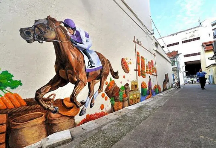 Depicting a racing horse cutting through a street market, the mural is aptly titled A Ride through Race Course Road. It spans 20m long, with the highest point touching 8m high.