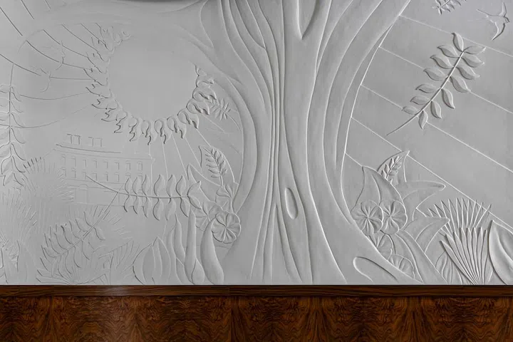 Most endearingly, the tale of this tree and its former home in Fulbeck Estate is captured in the plaster frieze that runs above the walnut panels. Even the soft corals, creams and pinks of the furnishings were selected to complement the richness of the wood.