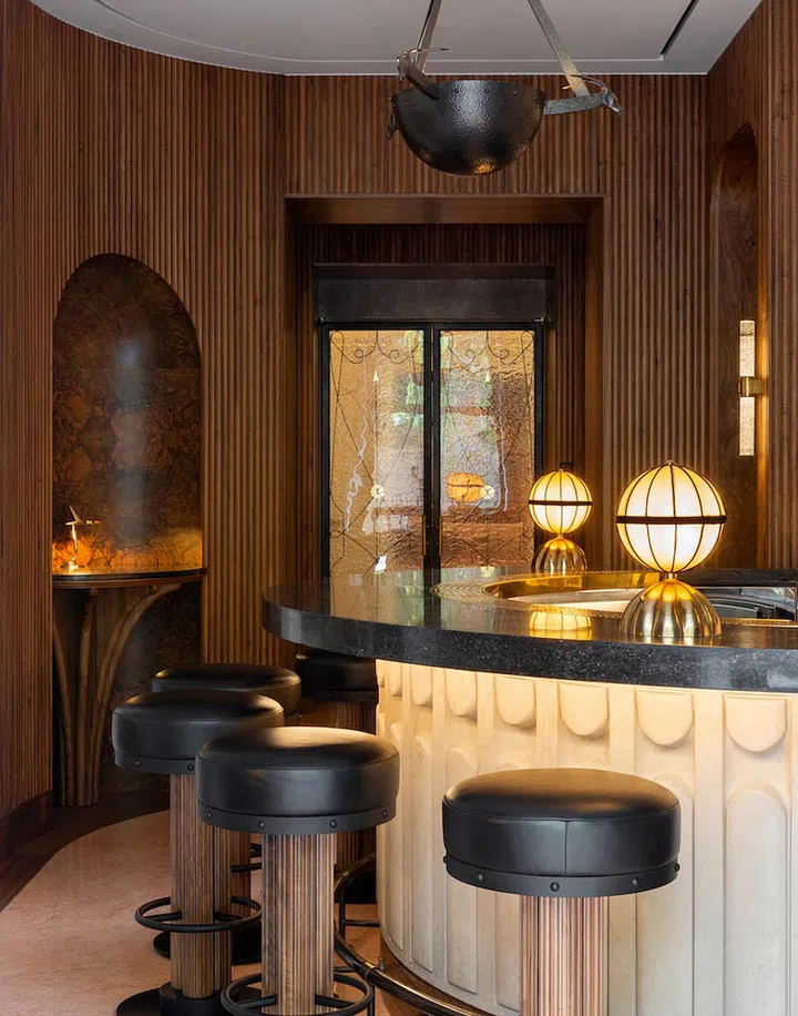 The old-world charm of the indoor space is not only evoked by its Art Deco-esque furnishings – from the globe table lamps and frosted glass sconces to the marble countertops and inlaid floors – but also in the plain fact that each element is bespoke and custom-made for the establishment.