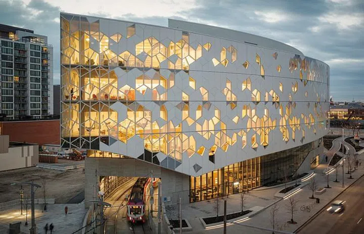 The Calgary Central Library designed by Snohetta and Dialog opened in November 2018 and is a hive of activity, partly because it is built over a light rail track that separates the downtown area from the less affluent East Village.