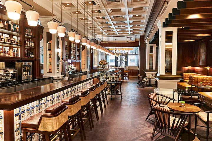 Decorative moldings abound on the ceiling, creating a classical European atmosphere in the bar area.