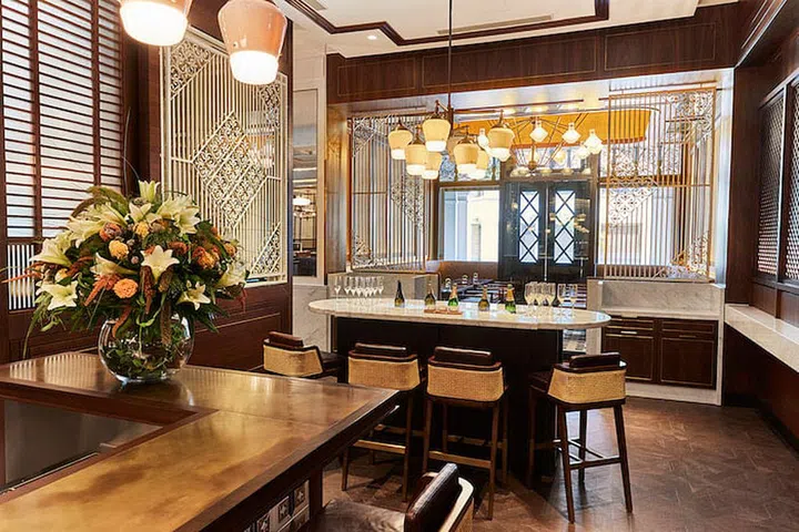 Classic geometric designs mix harmoniously with colonial influences around the champagne bar counter of the hotel’s signature restaurant.