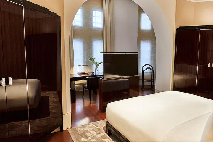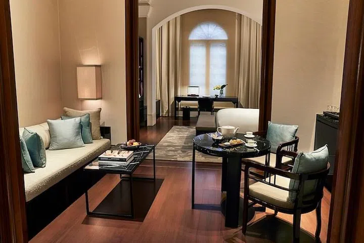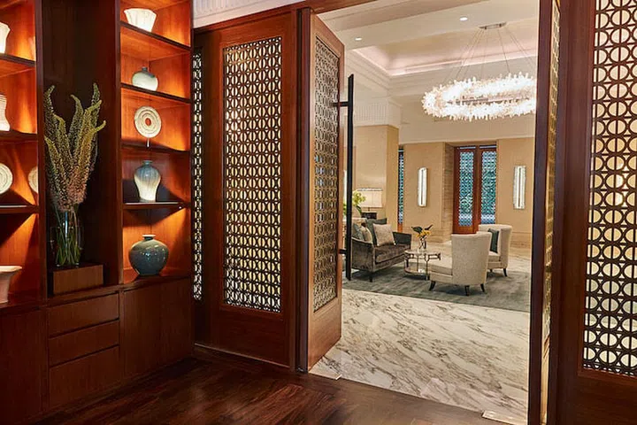 Travertine limestone columns, high-gloss piano rosewood lacquered finishes and Italian marble floors showcase the richness and opulence of Victorian design and are beautifully juxtaposed against muted warm tones, lightly embossed champagne-coloured wallpaper and the integration of Chengal wood flooring from the original building.
