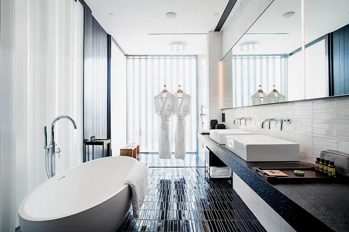 Rich brown ceramic parquet tiles with brushed bamboo textures clad the floor in the bathroom for a tactile experience. Take in the relaxing atmosphere at The Middle House while on your next vacation in Shanghai, in this home away from home!
