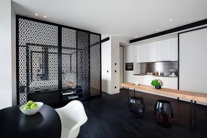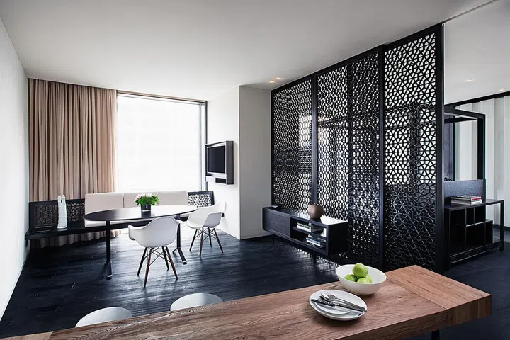 To heighten the sense of space in the serviced apartments, while ensuring there is enough privacy in the bedrooms, Lissoni replaced walls with sliding wood panels. This strategy also offers the possibility of a flexible living area.