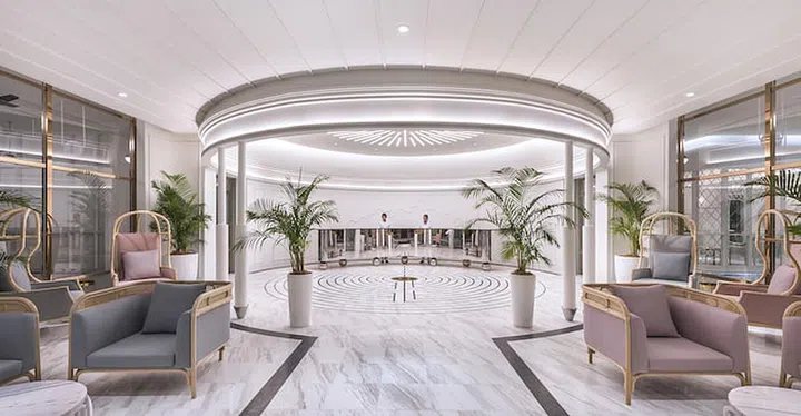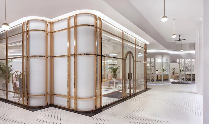 Indeed, the polished layout of the entire ground floor space harks back to English influences, with the retail units, the restaurant, and the reception area conceived as standalone stores – a unique shop-in-shop concept modelled after historical English shopping arcades.