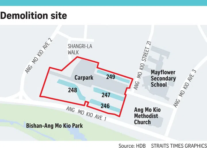 Come February next year, Blocks 246 to 249 in Ang Mo Kio Avenue 2 and Avenue 3 will be torn down to make way for new homes, The Straits Times has learnt.