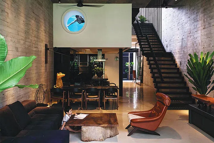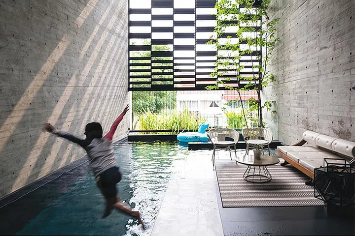 A multi-generation house designed to embrace natural ventilation, its star attraction is the indoor pool that feels more like an outdoor pool (thanks to the ventilated facade), while strategically-placed plants provide a degree of privacy.