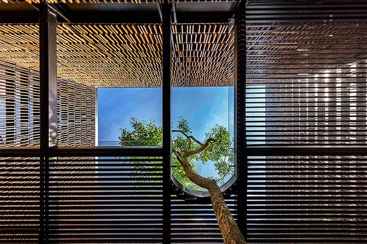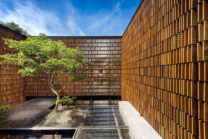 The courtyard screen is over eight metres high and is made up of timber slates, creating a rhythmic and layered facade.