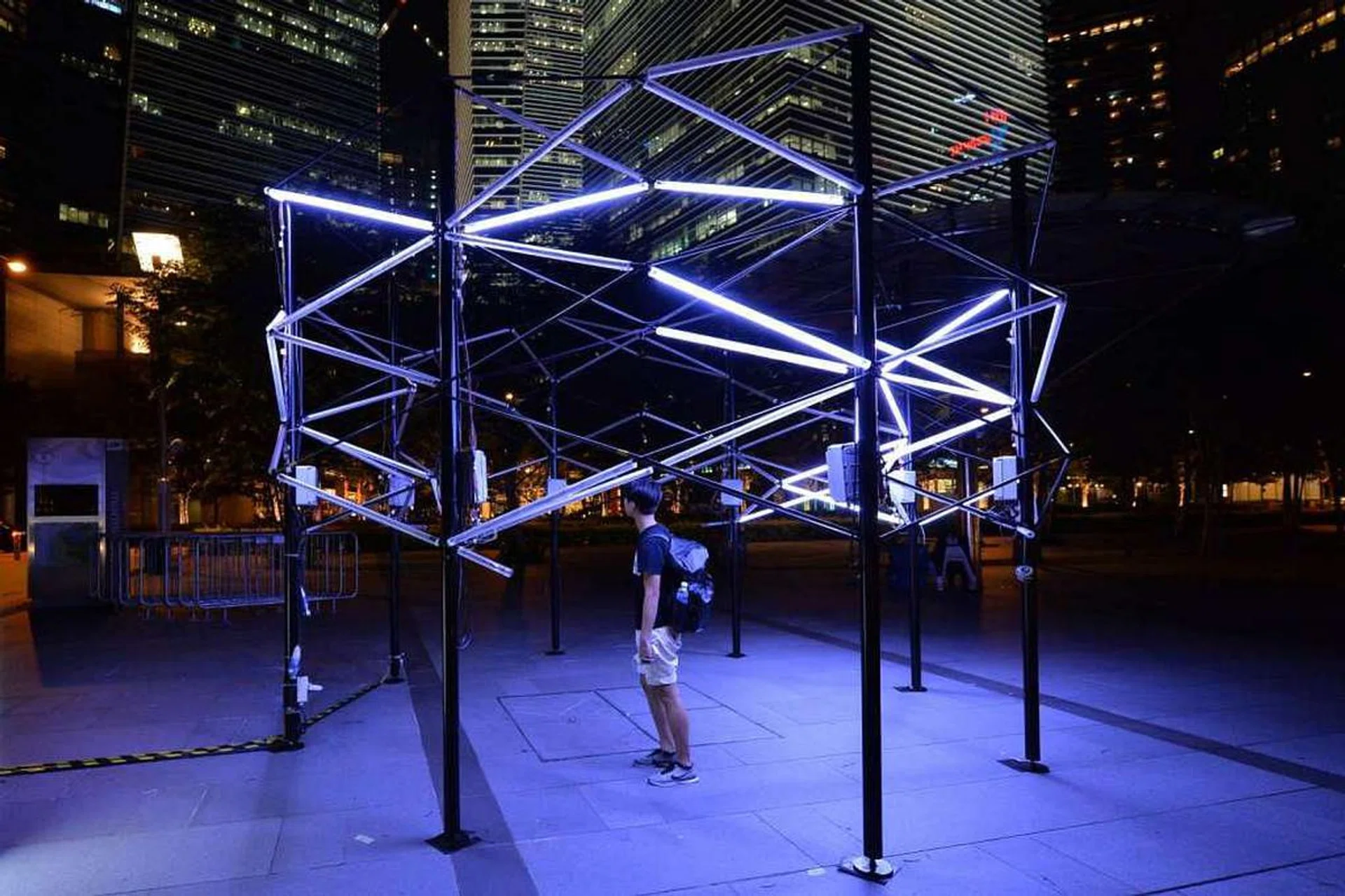 What: Inspired by city life, sound artist Zulkifle's work is made of scaffolding and accompanied by a melodic composition of sounds usually heard at a construction site. The 15m-high installation is made up of 320 solenoids (electromagnetic devices) and LED lights.