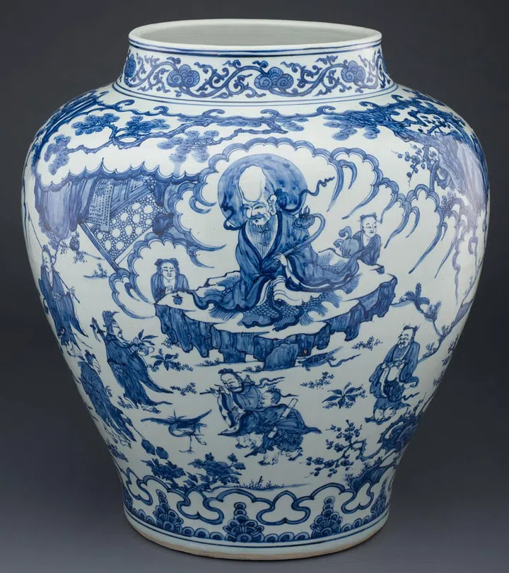 Porcelain, China, 1522 to 1566 This exquisite jar with a vivid depiction of Taoist immortals gathering to pay their respects to the god of longevity was probably made by a private kiln in Jingdezhen for the imperial court of Emperor Jiajing, who reigned from 1522 to 1566.