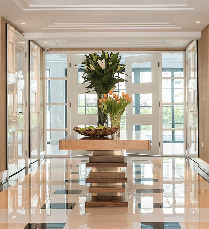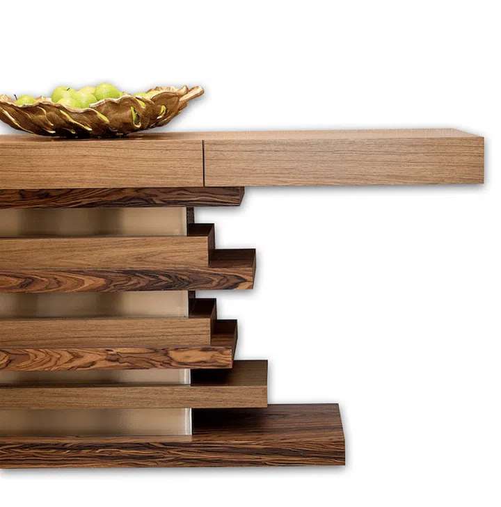 The table, designed by the studio and handmade at its Johor Bahru factory, has varying wood tones and gold metal accents. The irregular sizing of each base layer is the perfect balance between simplicity of form and layers of detail that make this hallway console unique and eye-catching.