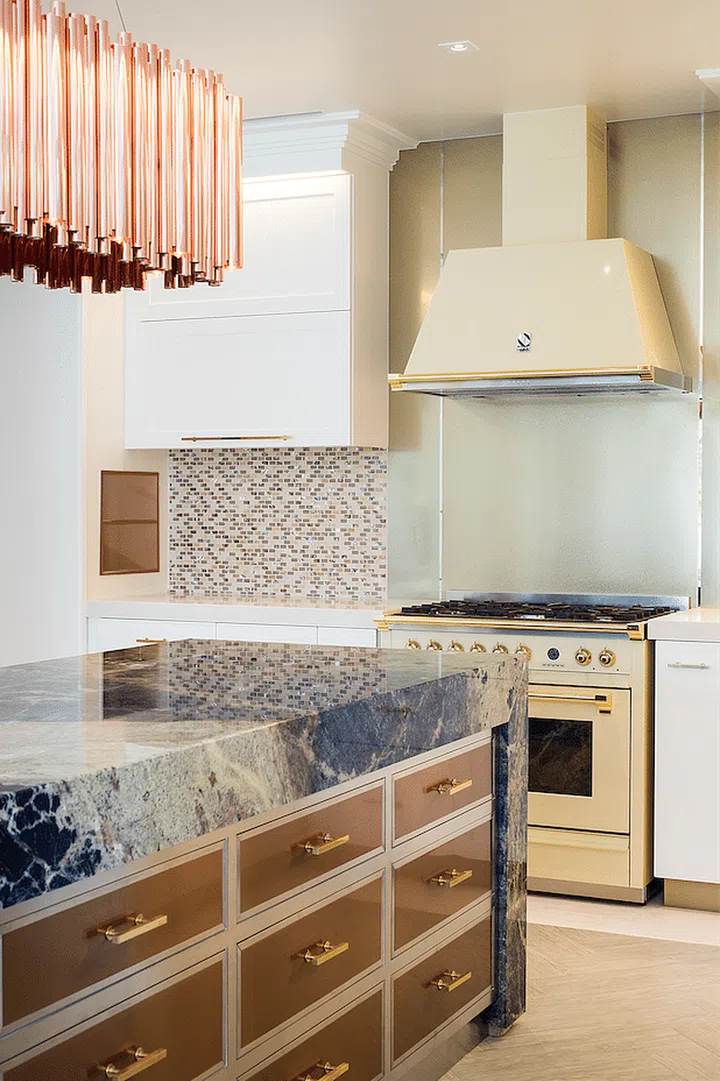 In the kitchen, copper, polished steel and gold tones are used. A vibrant blue heavily-veined granite is used for the island top to add intricate details to the space. It provides a show-stopping focal point and a visual anchor to the space.