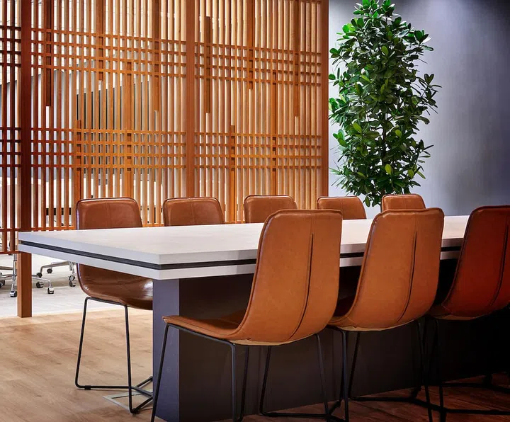 Natural materials like leather seats and wood tones of the flooring and screen give the office a warm and comfortable ambience.