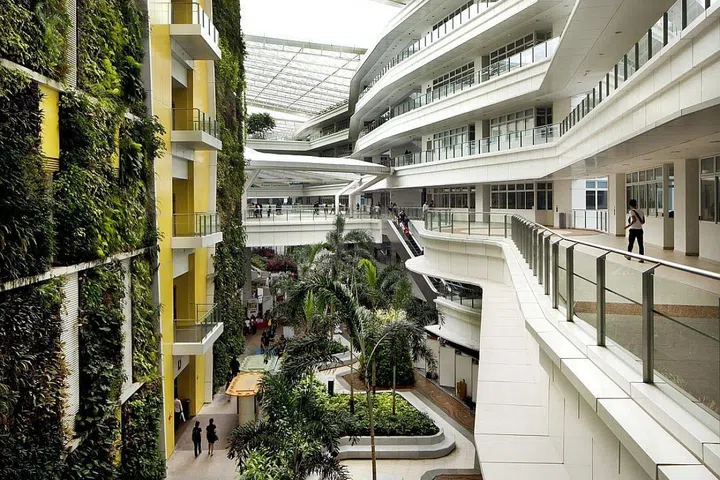 The complex features a continuous overhead canopy, which shelters students and staff while allowing natural daylight in. Solar panels installed on the roofs generate electrical power. The campus also has a green wall that stands at 30m tall and covers 5,600 sq m. One of the largest installations of plants in Singapore, it serves as a heat buffer.