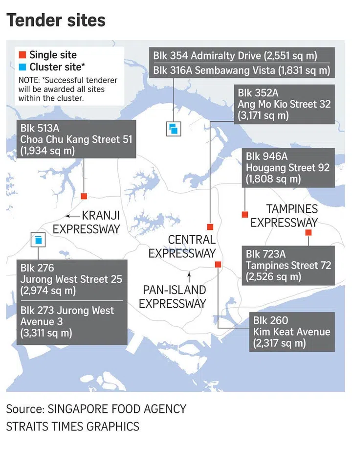 The tender for nine such sites was launched on Tuesday (May 12) by the Singapore Food Agency (SFA).