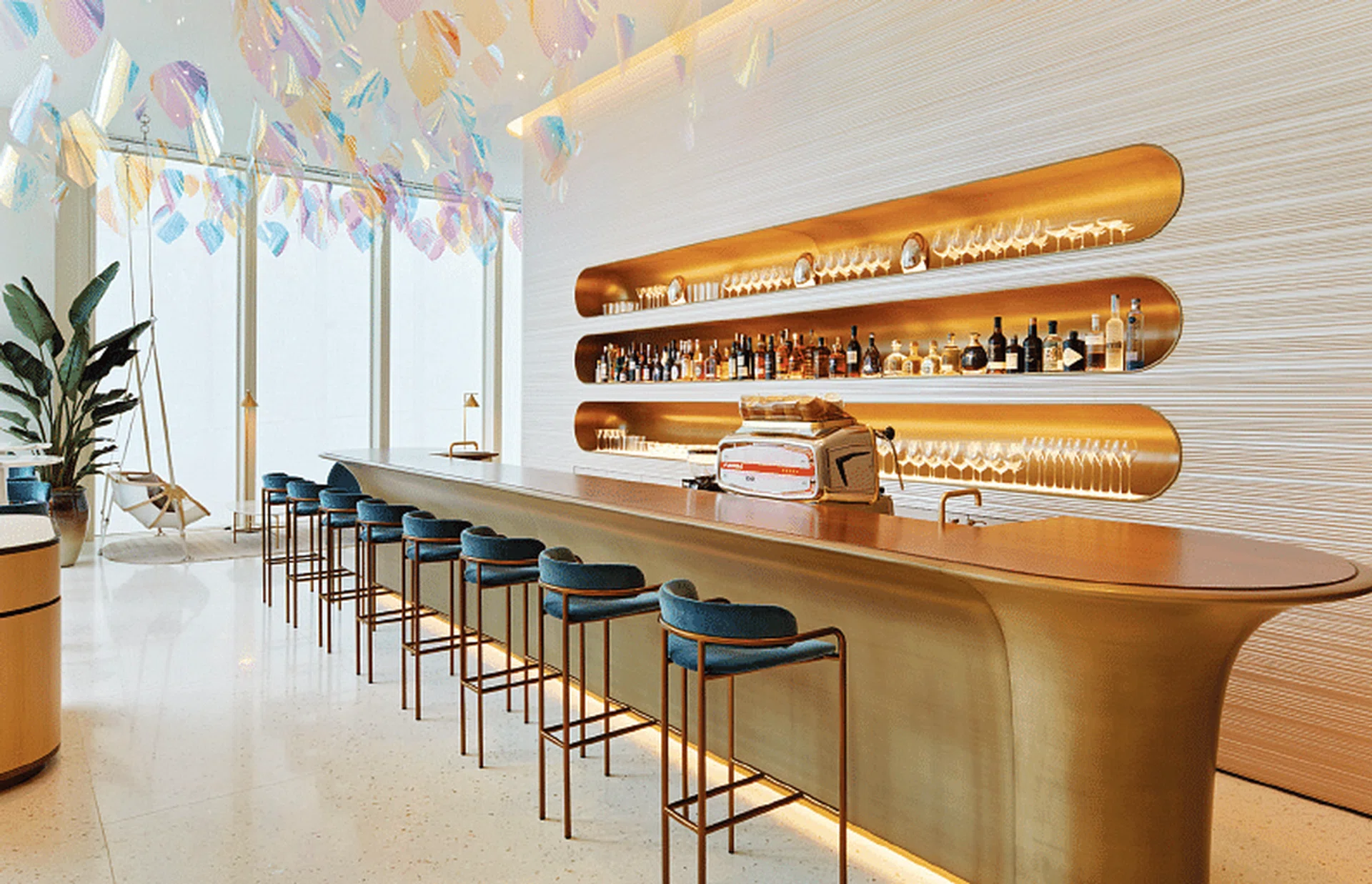 Inside, the nautical theme continues. Architect Peter Marino used wooden floors, wood-clad pillars and metal ceilings to give the impression of ship decks, embodying the spirit of adventure and travel.