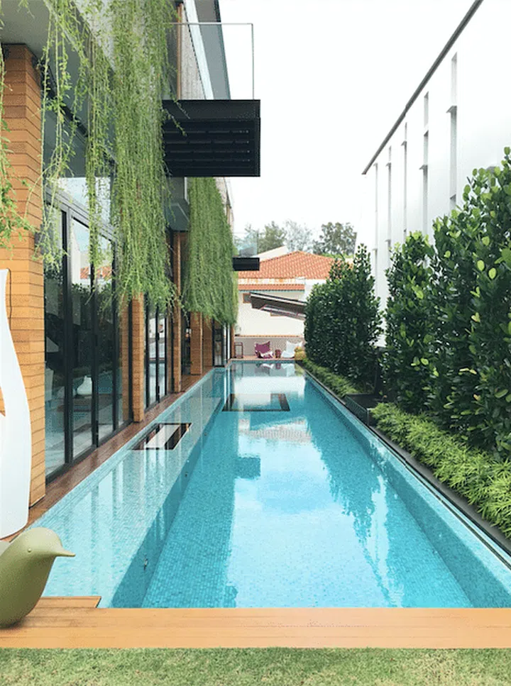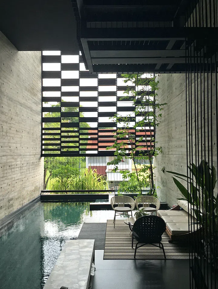 The house features a 13m long and 1.3m deep pool on the second storey that is perpetually lit via two connected inner atriums.