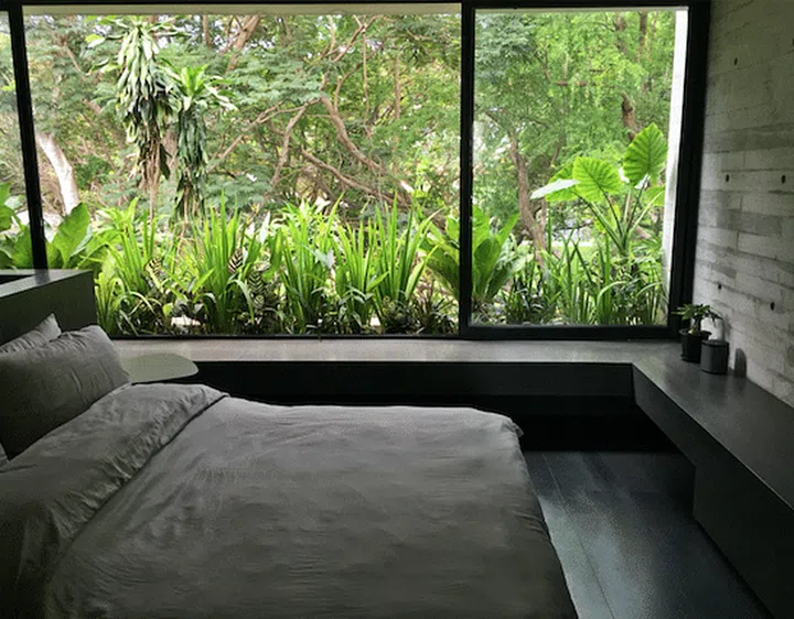 The bedroom cluster is all deeply set in from the western front and designed to maximise views of the extensive greenery behind.