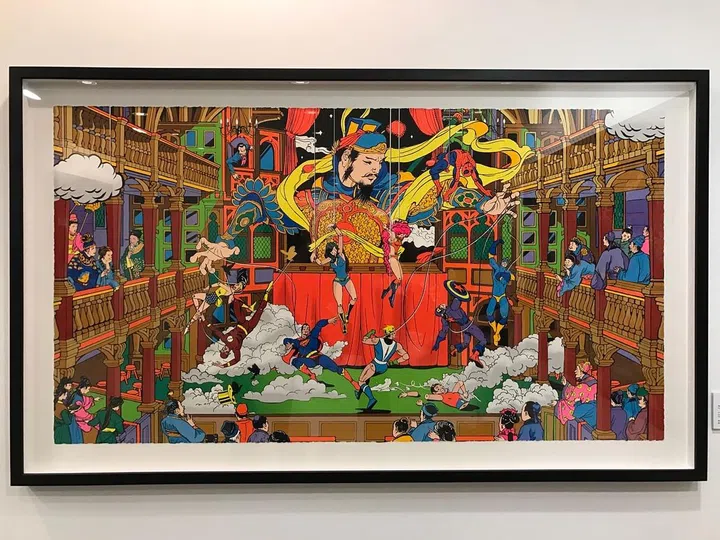 This 'almost-anime' like piece is called Puppets, by Jacky Tsai. It features a mix of Eastern and Western well-known cartoon imagery blended into the scene of a fight breaking out across the stage of a Chinese theatre hall. We like it because there's so much action packed into one print, and if you're looking for something interesting to fill that wall in your living room, this could well be it! Psst... this piece goes for $2,095 (unframed) and $2,595 (unframed).