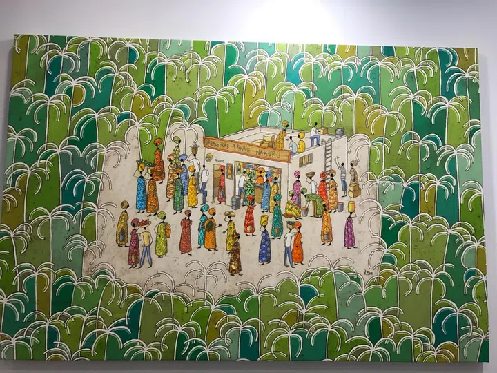We're in love with this piece by Angola-born artist Alvar Farre. Drugstore & Phone Nakuru showcases a scene with the Mwela people in Southern Angola, from the area of Huila. The interesting technique draws you into the image and instantly transports you into the scene. The details in the ladies' dressing are also something you can pore over and appreciate.