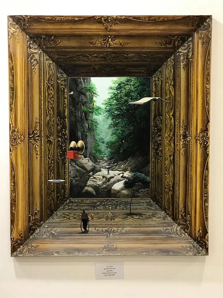 Feautring artworks from South Korea, this piece captivates simply because you can't tell where the frame ends and where the art begins. This visual illusion also brings to mind the question of how one defines art because if art is all about craftsmanship and skill, then the intricately gilded frame should be considered an artpiece on its own, no? Welcome to the Matrix.