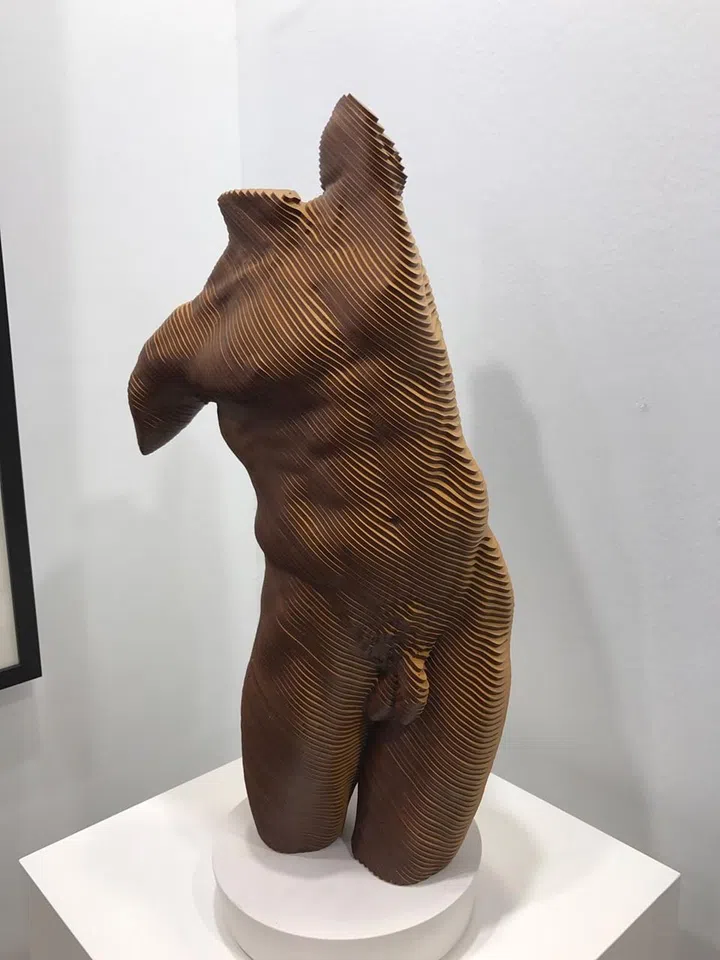 We had to dedicate two mentions to this booth simply because it's got so much interesting works on the walls. Meet Bruce, by olivier Duhamel. Bruce's Adonis-like pose and torso is created from diagonally-cut wood panels. Resembling a topographical map laid over a human body, the artwork is fascinating because it changes its form depending on where the viewer is standing and the way light is shone on the undulating yet sexy curves. And at $5,500, we think it's quite a steal.